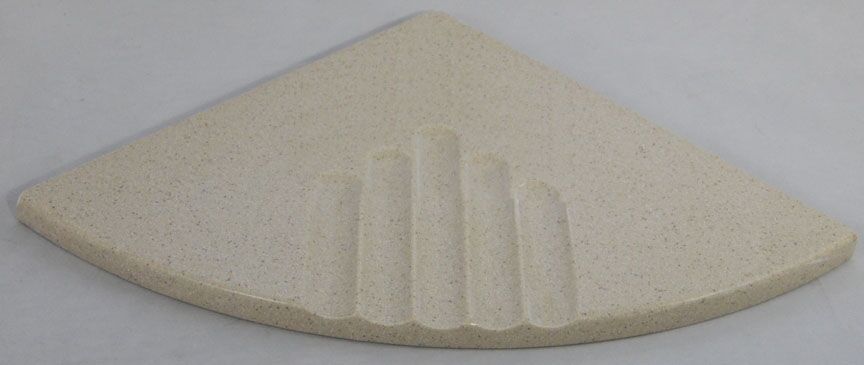 Solid Surface Corner Shelves preserves the Rock Solid branch from the legacy shelves page. These are made-to-order Corian and solid-surface bathroom shelves offered in several shapes and many color choices, with smooth or grooved faces depending on the application.